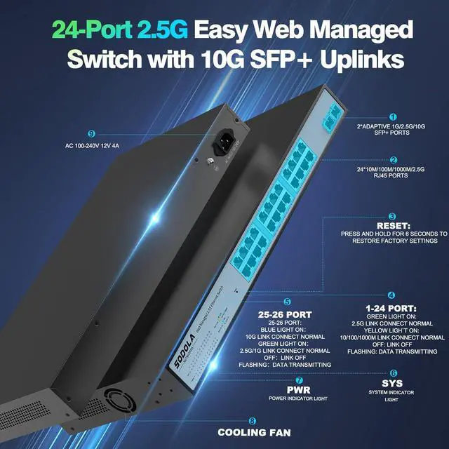 1U Mounted SFP+ SwitchThe Multi-Gigabit switch supports 1U rack mounting, adopts bilateral cooling design without built-in fan, assembled with high-quality metal casing, and superior product design to enhance the product using experience.