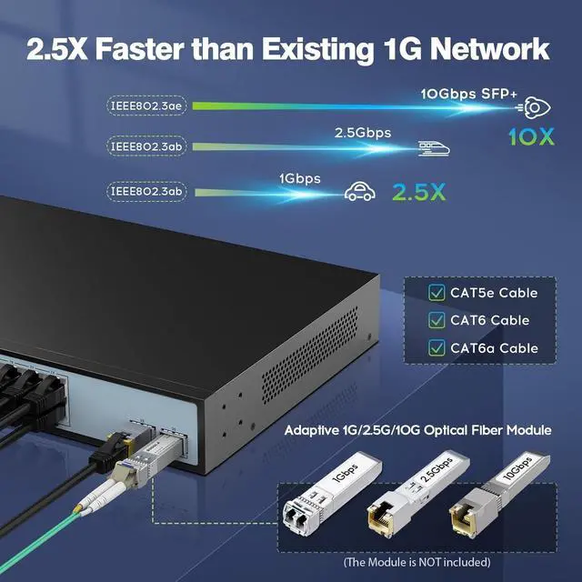 Universal HarmonyThe 2.5 gb Ethernet switch is compatible with various Ethernet devices; consider upgrading for optimal 2.5G b experiences, such as 2.5G WiFi 6 AP, 2.5G NAS, 2.5G PCIe Adapter, 2.5G Server and more.