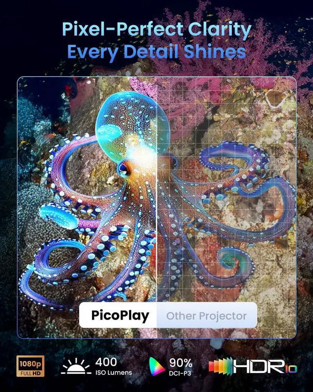 ,: Project effortlessly from wall to ceiling. The 88° Rotating Gimbal and Flexismart System automatically optimize the image, ideal for movie nights in bed or couch relaxation.