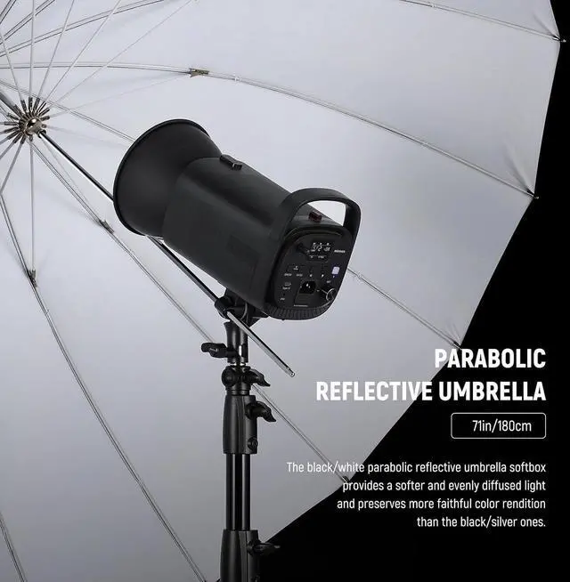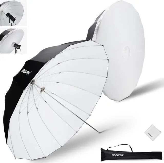 Sturdy Build The nylon black exterior and the PVC white interior are durably built for a long lasting life. 16 highly resilient ribs offer an impeccable parabolic shape that withstands tens of thousands of presses without deformation, and are heat resistant to high temperatures and other demanding weather conditions. Also includes a cleaning cloth to keep the umbrella always ready for your photography