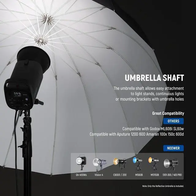 Built in Handle The built in handle allows easy attachment to tripod light stands, continuous lights, or mounting brackets with umbrella holes, compatible with NEEWER Q4 Vision 4 CB200B RGB CB60 MS60B MS60C MS150B S101-300W PRO/400W Pro flash strobes studio lights and continuous lights, compatible with Godox ML60Bi SL60w compatible with Aputure 120D 60D compatible with Amaran 100x 150c 600d etc.