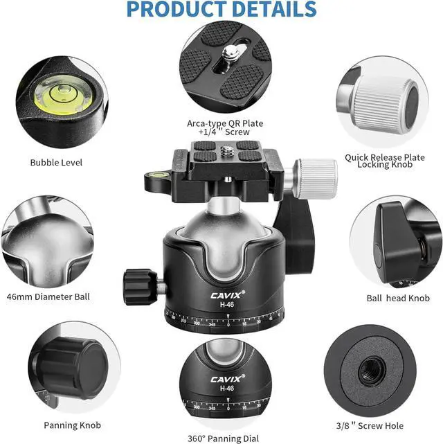 All Metal & CNC Machining46mm diameters camera ball head, more stable. 1/4 & 3/8 thread for any tripod, monopod or other equipments.