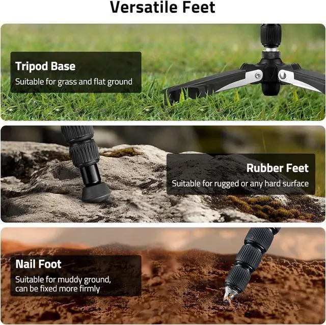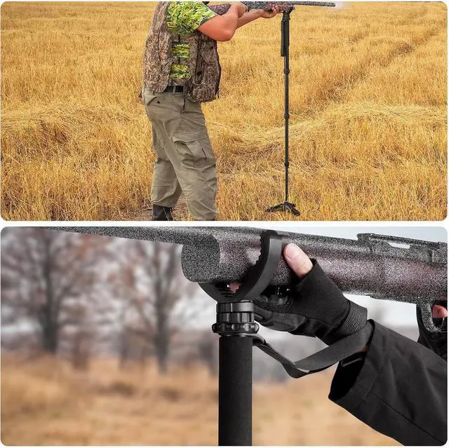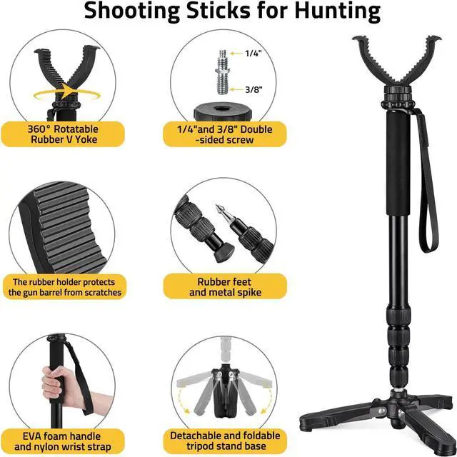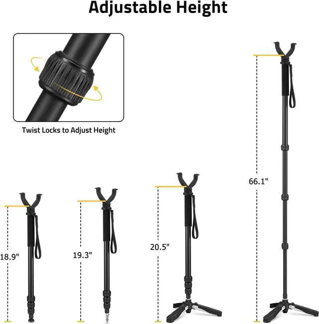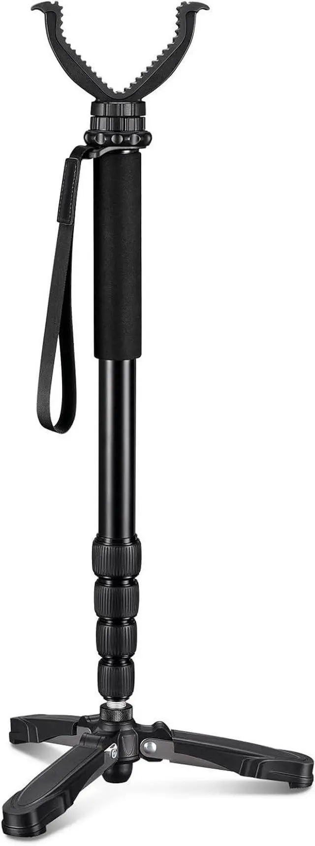 3-in-1 Shooting MonopodOur shooting stick is equipped with rubber feet, metal spike, tripod base, and can be adjusted into 3 types to suit different scenarios such as flat ground, mud, and grass. You can use it as a walking stick, trekking pole, or as a pull rod to drag prey according to your needs.