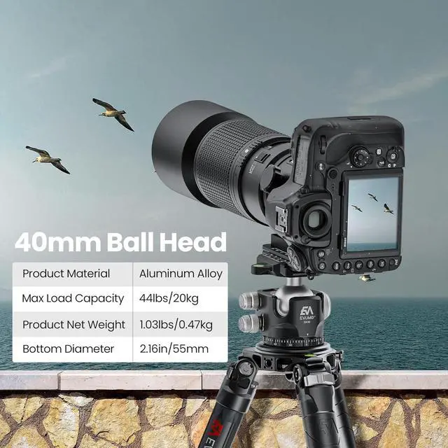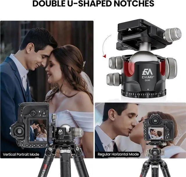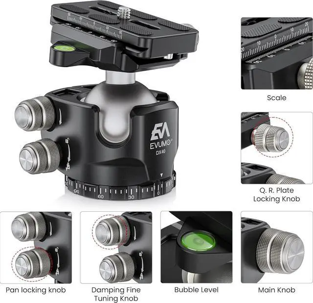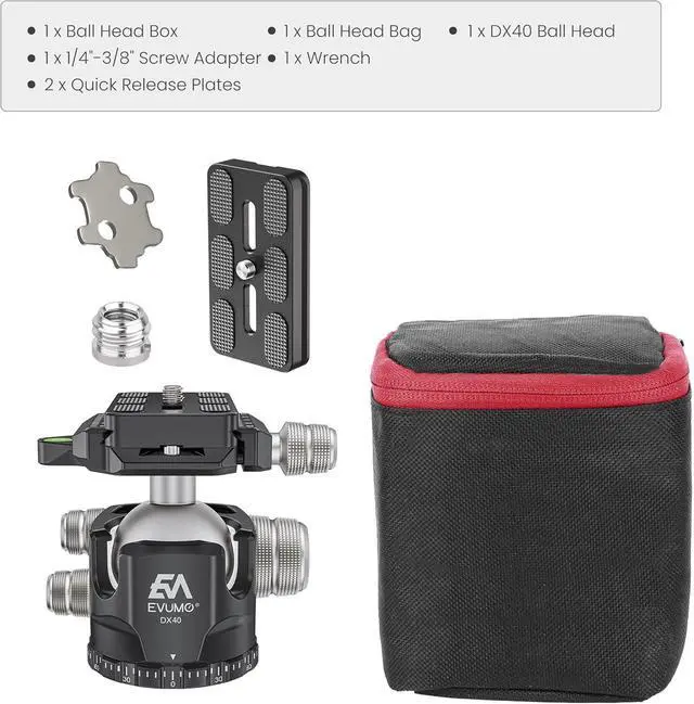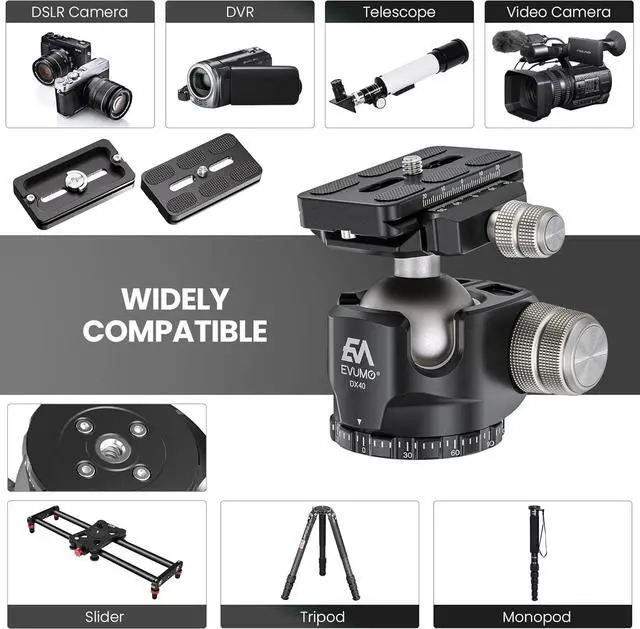 Wide ApplicationDX40 tripod ball head mount comes with two quick release plates, 1/4'' screws compatible with Nikon Canon and other brands of cameras. The bottom 3/8'' threaded hole is compatible with tripods, monopods, camera sliders, etc. The 3/8'' to 1/4'' screw adapter is compatible with other types of photographic equipment.