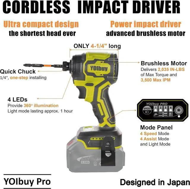 CONVENIENT AND SAFETY: the brushless impact driver has 1/4 inch "Quick Chuck" fits all type 1/4" ( 6.35 mm) hex bits. 4-eye LEDs provids additional "Lighting Mode" for up to 1 hour. Overload protection prevents motor burnout. A belt hook and a magnetic bit holder for convenience are included. Besides, IP54 rating resists dust & splashes for jobsite durability.
