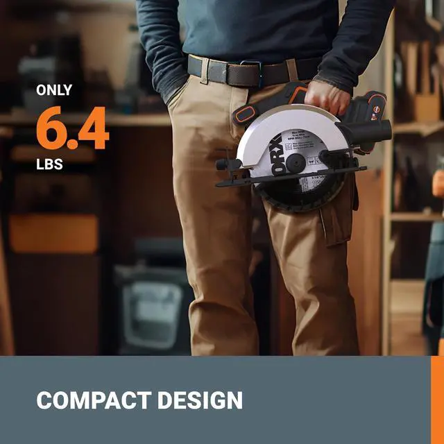 The Worx cordlesssaw and circular saw combines power and portability for efficient cutting. With a max. cutting depth of 2-3/16 and a high-speed 4700 rpm, Worx 20V circular saw is ideal for cuttingthrough 2X lumber effortlessly. At just 6.4 lbs., Worx cordless circular saw is lightweightandcompact design provides exceptional comfort and control. Worx power circular saws '0-50°tool-free bevel adjustment and easily adjustable cutting depth enable precise and angled cuts. Worx battery circular saw s front hand grip offers added stability, while the integrated LED light and cut-line indicator enhance visibility and accuracy.
