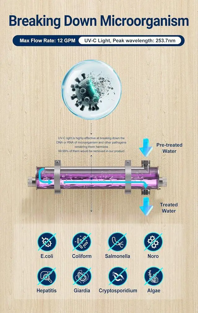 9000 hours Life of UV bulb. Efficiency Purification: Reduce 99.99 % microorganism. Professional manual book are contained. Installation, maintenance, troubleshooting are easy to finish with that.