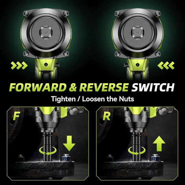Bidirectional and Smart Auto Stop: Easily switch between tightening and loosening modes with the forward/reverse switch. When in reverse, the smart brake mechanism activates to prevent the nut or bolt from accidentally falling off. The safety lock prevents accidental activation for added protection