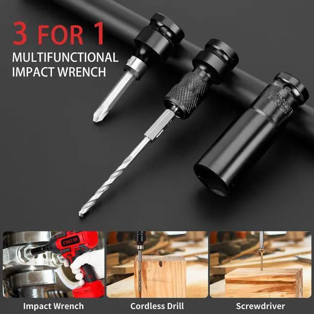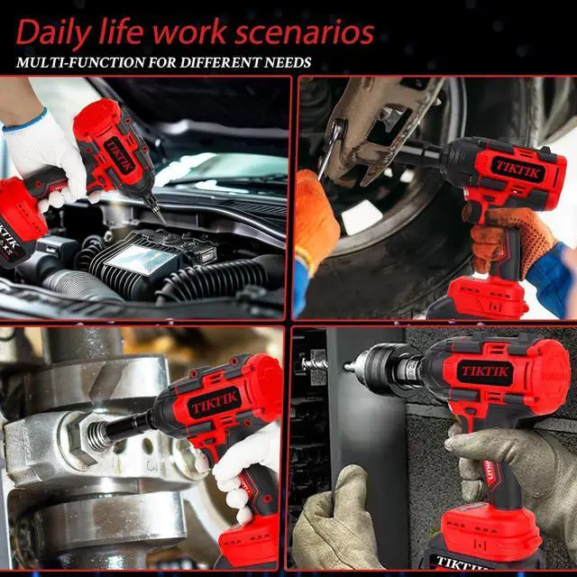 TWO-WAY BRAKE- This brushless impact wrench has a two-way brake mode, activated in reverse mode, once the nut or bolt is loose, it will reduce the speed and torque to prevent parts from splashing, thus protecting your safety. In addition, this 850N. m electric wrench contains extremely rich accessories, not only sockets but also a variety of bits, it can be used as an impact drill, a tool can be used for multiple purposes.