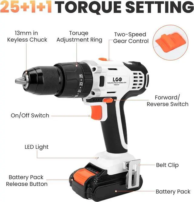 1/2'' Keyless Chuck&Ergonomic Design-LIGO 20V cordless drill offers both power and control with a soft grip. A 1/2'' keyless chuck is for fast and easy bit changes.