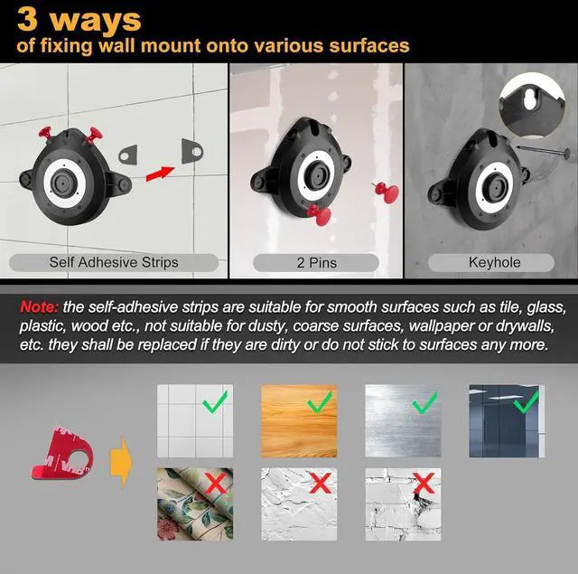 Three Fixing Methods: 2 pins for rough surfaces; 6 self-adhesive strips for smooth surfaces (not suitable for dusty, coarse, wallpapered, or drywall surfaces); top pin hole for hard surfaces and other general use