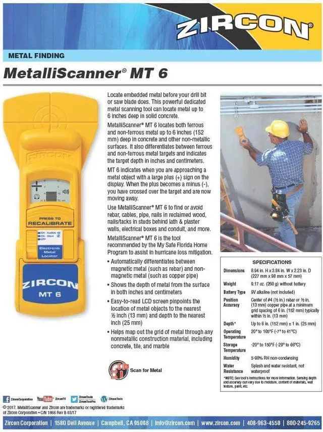 The Zircon MetalliScanner MT6 Professional Metal Detector is a high-performance handheld tool designed to accurately locate ferrous and non-ferrous metals behind walls, floors, and concrete. Ideal for construction, remodeling, and renovation projects, it detects pipes, rebar, nails, and other metal objects with precision. Its ergonomic design and intuitive interface make scanning easy and comfortable, while the bright display clearly indicates detected metal locations. Whether youre a professional contractor or a serious DIYer, the MT6 provides reliable results for safe drilling, cutting, and installation.