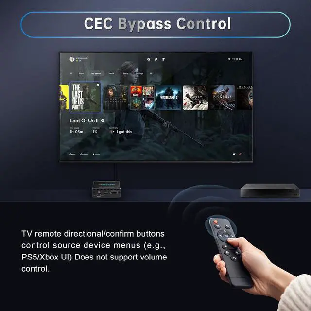 Easy UsagePlug and play. Power on with 5V/2A, connect PS5 or XBOS and other sources to input ports with HDMI cable, and then the display to the output port, according to the sound and picture quality you need to mediate ARC mode. If the product does not work, please check if there is a problem with the power cord you are using, replace the power supply and try unplugging again. If the problem cannot be solved, please feel free to contact us for replacement at any time