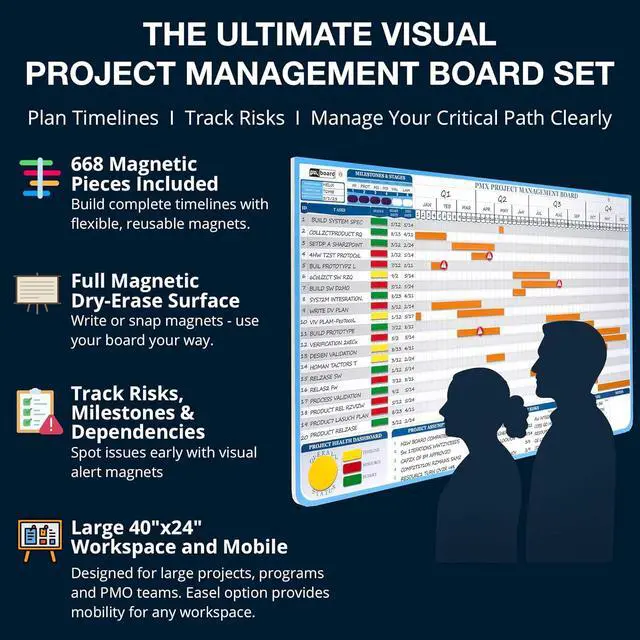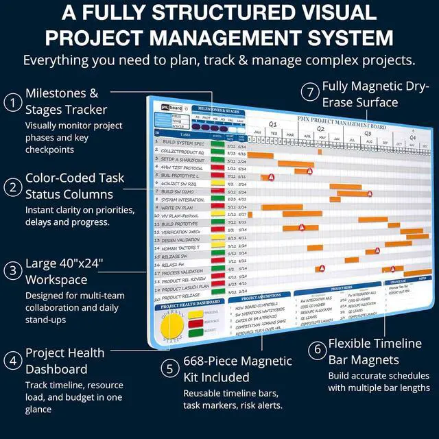 Premium Project Management Board Kit. Experience premium quality with the PMXBoard brand. Frameless, double-layer magnetic Gantt chart board for durability and strength. Wide variety of project magnets, unique magnetic properties, and a wear-resistant board surface for a superior project management experience. Ultimate Gantt Chart Board Planner