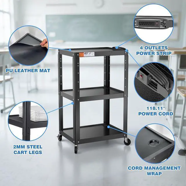 LONG RANGE USE: Our 3 tier rolling AV cart features a built-in power strip with 4 outlets, a 118.11" power cord to charge multi devices over long distances. And equipped with a cord management wrap on the shelf to keep your cables organized. The flexibility of this rolling computer cart can also be use as standing desk, mobile laptop station or mobile home office.