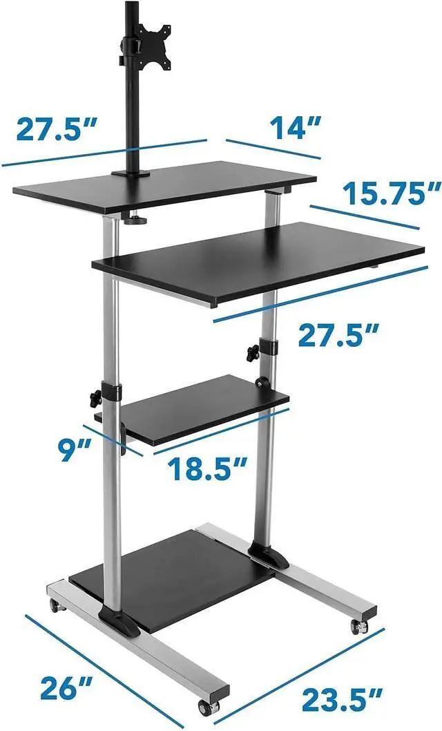 Effortless Mobility with Secure Locking: Navigate through classrooms, offices, or home spaces with the smooth-rolling caster wheels, designed to glide over most surfaces with ease. And when it's time to stay put, the robust locking mechanism on this mobile desk ensures a steadfast and stable platform for presentations or focused work sessions. The monitor mount also tilts 15 degrees.