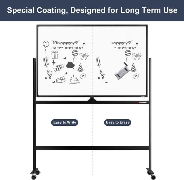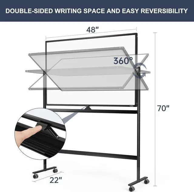 DUAL SIDED FOR MULTIPLE USES - 48" x 32" white board is capable of being rotated 360 degrees and can be locked into place to prevent movement. Twice space of a wall mounted whiteboard with this reversible dry erase board. Effectively take notes and teach with TANKEE mobile whiteboard. Use for office settings, or training sessions, conventions, parties, classroom, school, scout camps and outdoor activities.