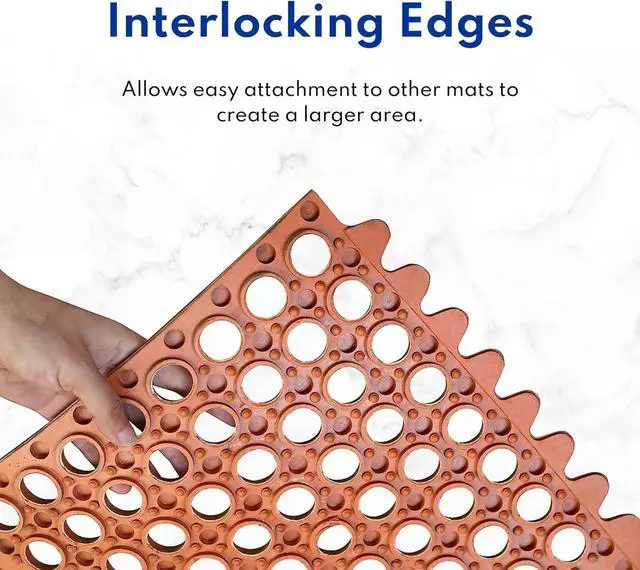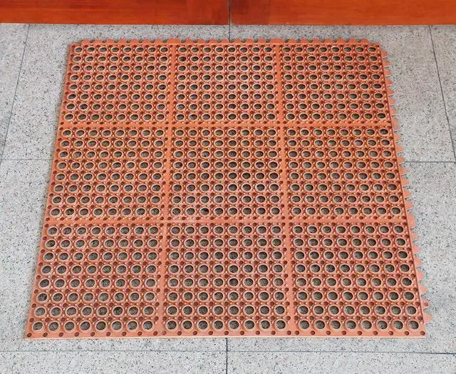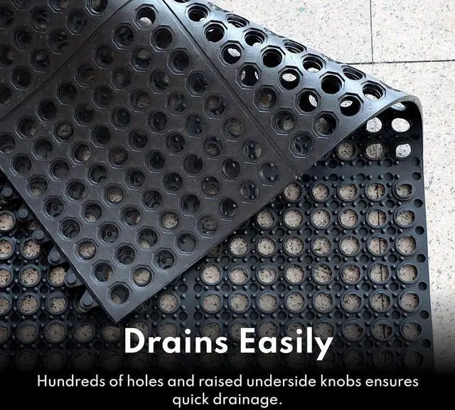 The drainage holes allow liquid and waste to pass through, making this rubber matting easy to clean and stain resistant providing a clean, dry and safe work area