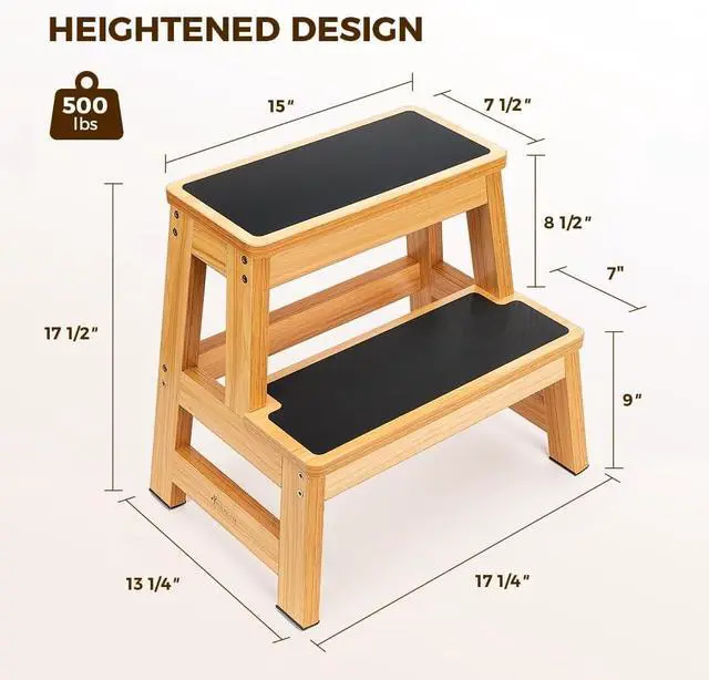 Perfect Height: Standing tall at 17 inches, our wooden step stool is the perfect height-boosting solution for your home. It facilitates easy access to hard-to-reach areas, like high kitchen cabinets or top closet shelves.