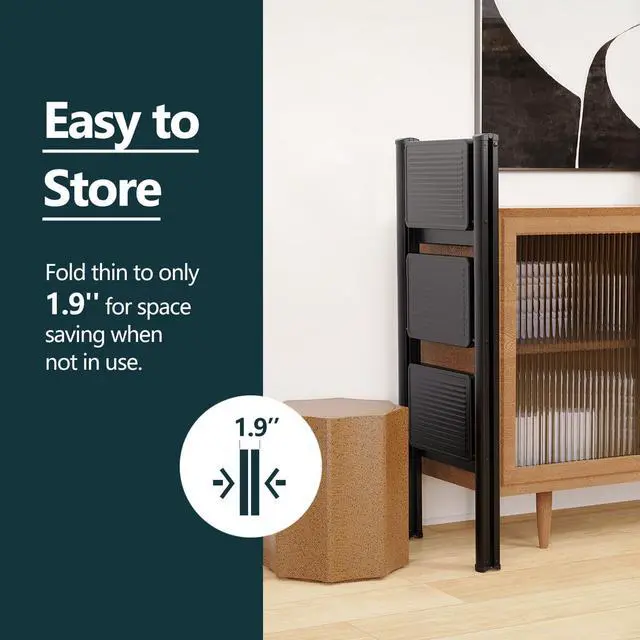 High Places Accessible: The 3-step ladder is portable indoors when folded; It can be used to reach high kitchen cabinets, high shelves in the walk-in closet, high windows, etc