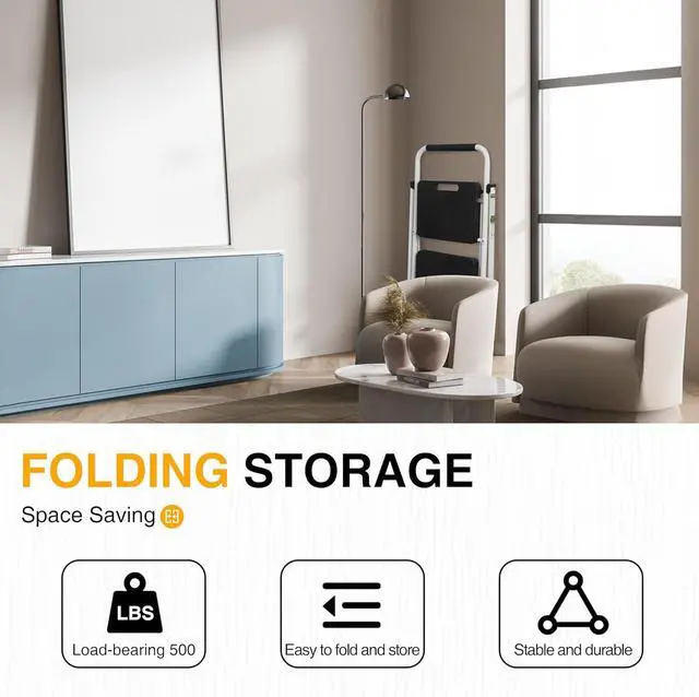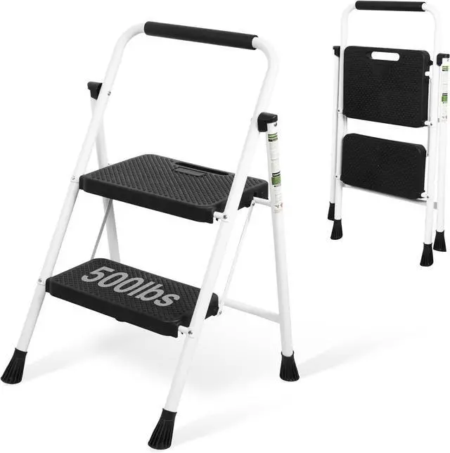 WIDE APPLICATIONS: This 2 step ladder can be used in several scenarios, such as homes, kitchens, offices, garages, etc. Also suitable for indoor and outdoor use