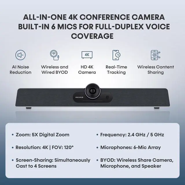 ,: MAXHUB smart conference webcam features advanced noise reduction technology, optimized for speaker in meeting room to reduce distractions like typing, door closing, and background noise. It ensures clear communication during conference by enhancing sound quality in large rooms or distant corners, without the need for additional noise reduction methods