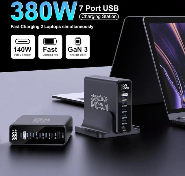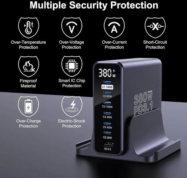 Superior Safety: Using V0 fireproof PC material and equipped with Ai temperature control detection system, our 380W USB C charging station is equipped with temperature protection, over-current, over-voltage, overcharge, overload, overheat and short circuit protection, maximizing the charging safety. Ensuring 100% complete protection for you and your devices