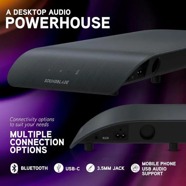 Multiple Connection Options - The Soundblade offers a range of connectivity options to suit your needs. Whether you prefer the versatility of auto switching USB-C, Bluetooth convenience or the simplicity of a 3.5 mm auxiliary input, the Soundblade seamlessly syncs with your laptop, MacBook, smartphone, or tablet.