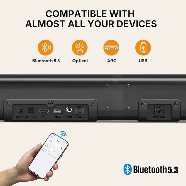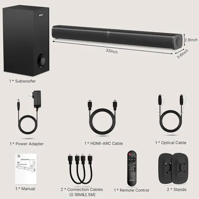 Detachable Design: Use as a 32 inch soundbar for concentrated sound under your TV or split into two 16 inch tower speakers for an enhanced surround effect. Choose your setup based on your needs for easy and flexible installation