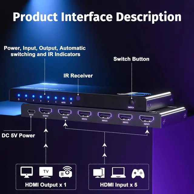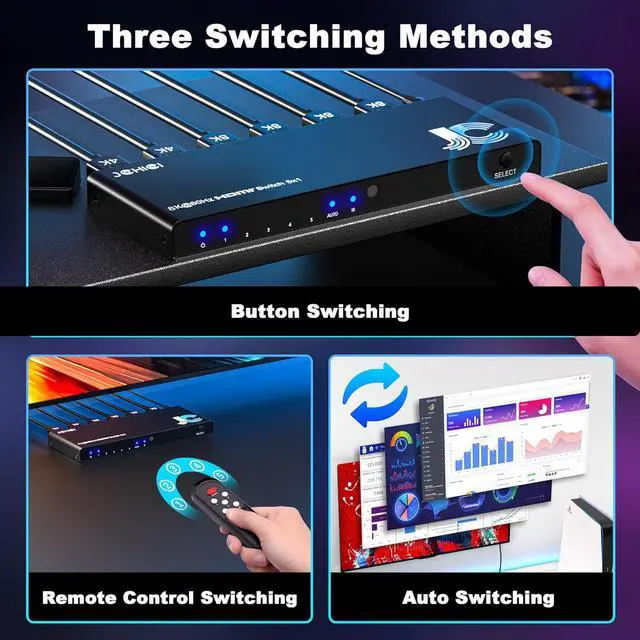 Dual Switching Modes IR remote control (8m range) + auto-switching when signal detected Manual mode toggle to prevent accidental switching (ideal for gaming/meetings)