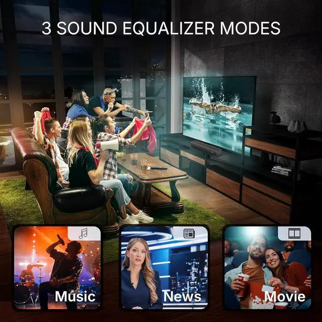 3 Audio Modes: DSP technology optimizes sound; Music Mode, enhanced bass for rock/hip-hop; Movie Mode, expansive surround for films; Dialogue Mode, speech focus for news/podcasts