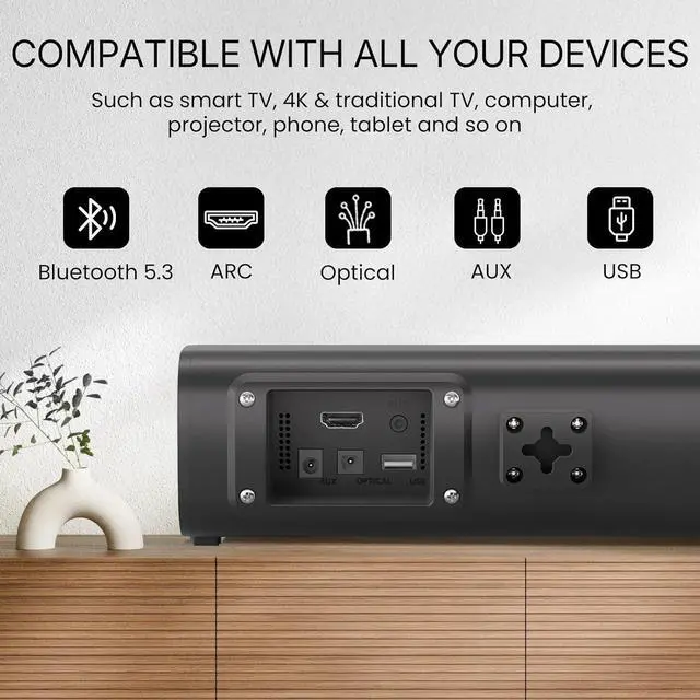 Universal Connectivity: Bluetooth 5.3 /ARC/Optical/AUX/USB ports. Works with smart TV, 4K and traditional TV, computer, projector, phone, tablet and so on