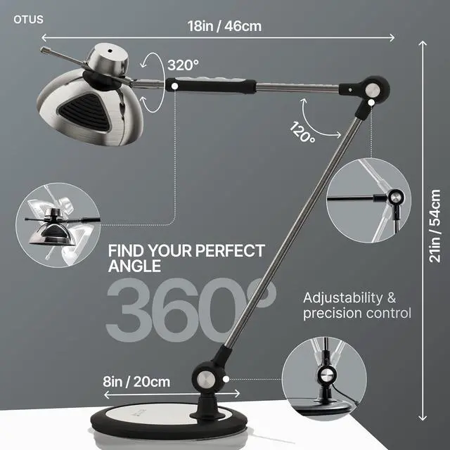 Durable Metal Construction for Long-Term Professional Use: Solid metal frame with reinforced joints and satin space-grey finish ensures stability and professional aesthetics; weighted swing arm desk lamp base stays secure without clamping; energy-efficient LED lasts 50, 000 hours and saves 80% energy; tall desk lamp built for daily professional use in offices, studios, and creative workspaces