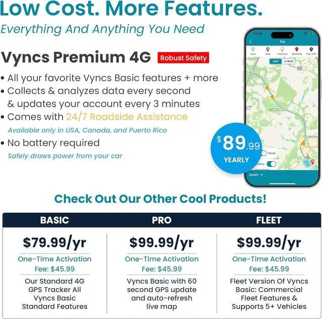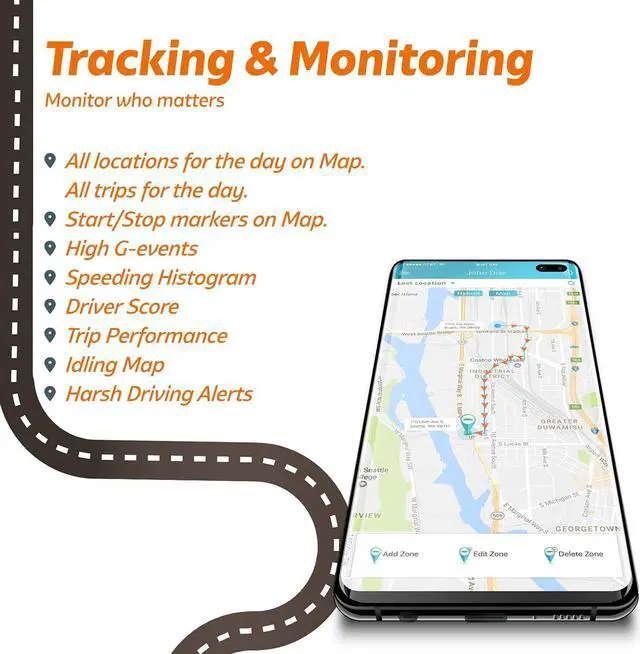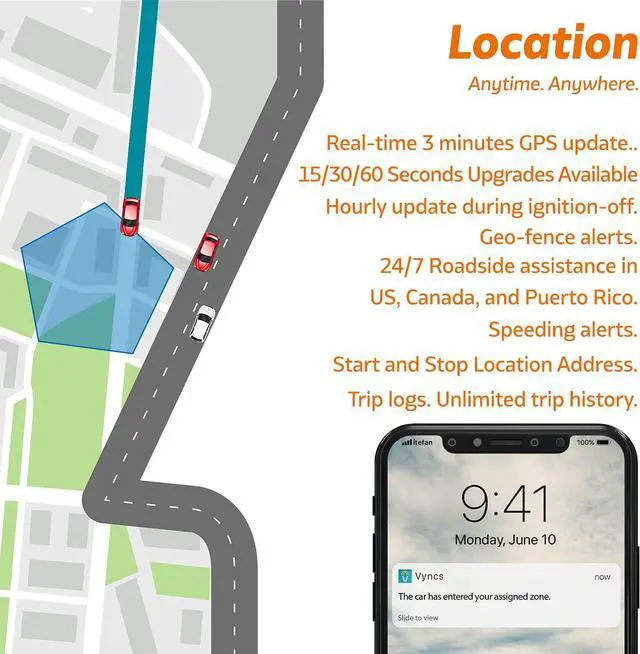 Get zone enter-exit zone notifications, driving score, real-time tracking, 1 year roadside assistance included.