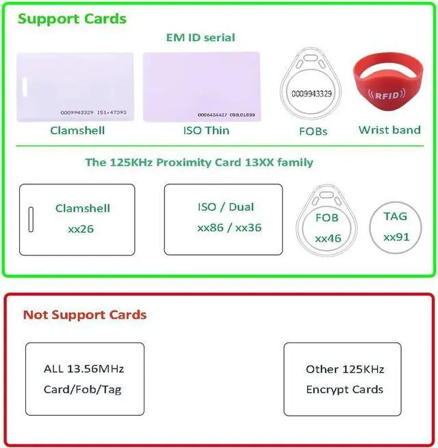 • 125KHz RFID reader supports EM4100 ID cards and also 1326 1346 1386 ISO Prox card, H10301 H10304 format etc.