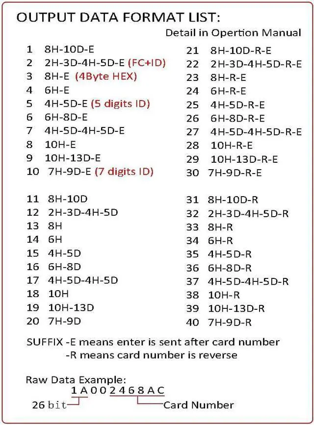 Advanced config process allow user to choice 20 clients format output and set prefix/suffix, ingore leading zero. This is read only. If you want to write card with ID/FC number, you may go ASINB0BCYRSLSF
