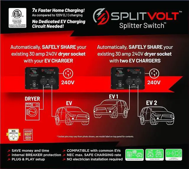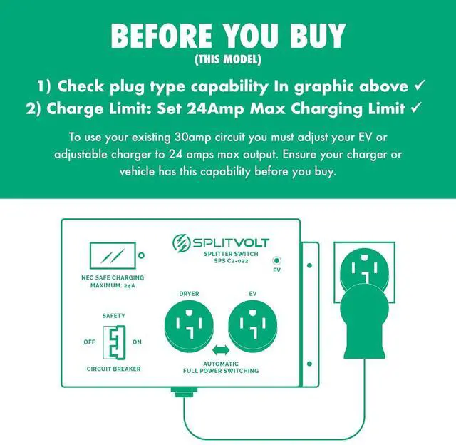 SAFE: Internal Safety Breaker Protects Home Wiring from Exceeding the 24 Amp NEC Maximum Safe EV Charging Rate, While Display Shows Real-Time Power Usage. Power your charging station with this cETLus Certified Splitter Switch so you can rest assured your EV charger is safe.