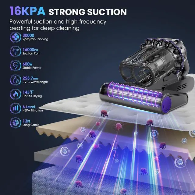 Comprehensive Safety Guards Whether using it as a bed vacuum or couch vacuum, the roller brush comes with locking rotor protection: if the brush gets entangled in fabric, the rotor may stop working automatically. The unit also includes safeguards against over-voltage, over-current, over-heating, and short-circuiting. Prolonged continuous use may trigger motor over-heating protection (leading to temporary shutdown) simply turn off the unit, let it cool, and resume use later.