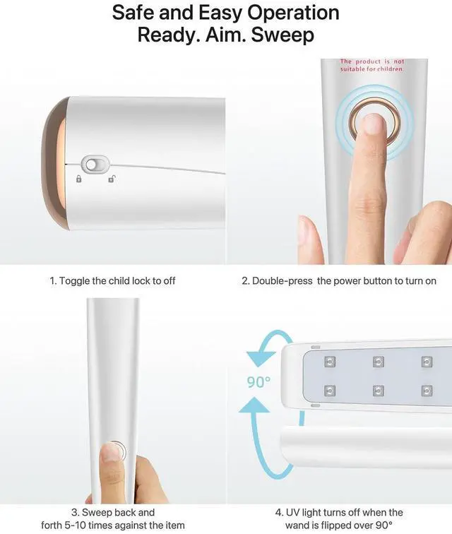 CHILD SAFETY DESIGN&SMART SENSOR: Automatically turn off when the UV light sanitizer wand flips over 45°to protect against contact with eyes. There is also a child lock to prevent injury caused