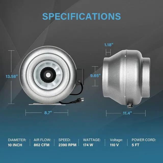 Specifications: diameter: 10inch; Air flow: 862 CFM; Speed: 2390 RPM; Wattage: 174W; Noise level: 70dB. 110V standard household plug; Pre-wired 5 Feet power cord.