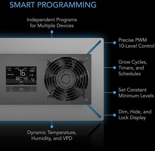 Dynamic temperature, humidity & VPD programming, with timers, cycles, scheduling, and minimum speed.
