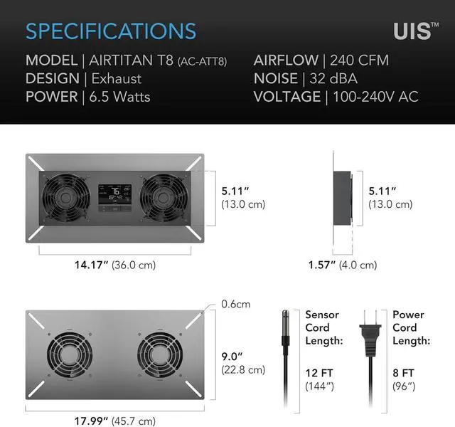 Connect to our app via WiFi or Bluetooth to program automation, view climate data, and receive alerts. Design: Exhaust \ Backplate Dimensions: 18 x 9 x 1.6 in. \ Airflow: 240 CFM \ Noise: 32 Dba \ IP55 Rated