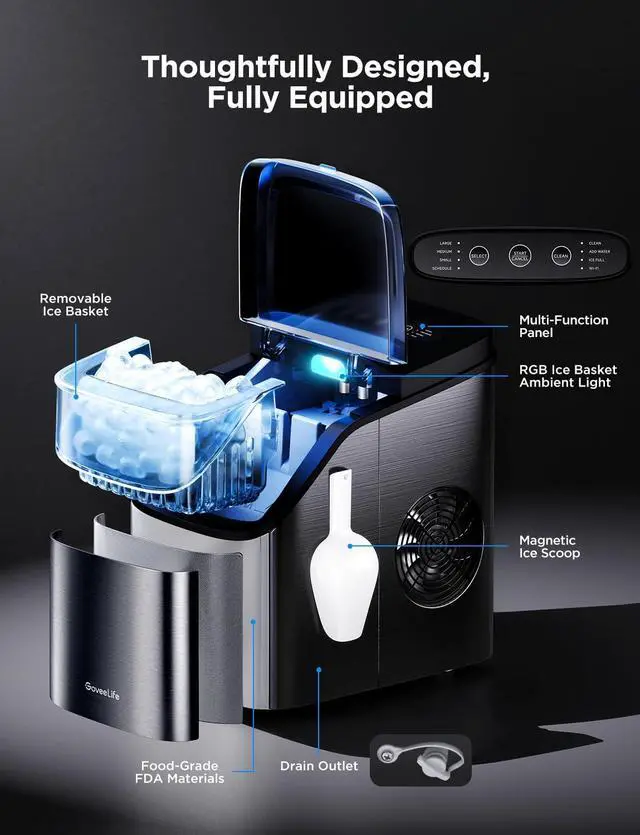 Smart Reminders: Monitor ice status and water levels via the RGB ice basket and app. The app will send you an alert notification when the ice is full or the device is running out of water. The RGB ice basket offers customizable color displays through the app, providing a personalized ice-making experience. (Note: The beeping alerts can be turned off in the app.