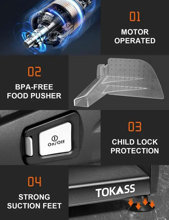 [Safety Protection] Non-slip suction cup feet keep the deli slicer stable while working, and the food pusher also acts as a blade guard to help keep your fingers safe. The on/off switch provides added safety