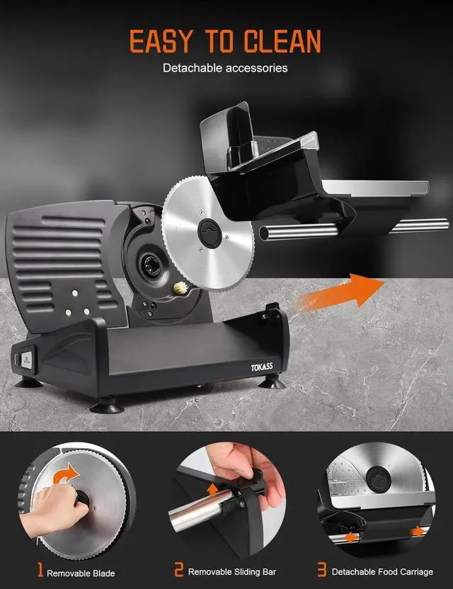 [Easy to Clean & High Efficiency] - The removable blade and cutting platform make cleaning the food slicer simple. The metal cover is simply wiped clean with a cloth. The blade, food carriage, slide-rod extension and food pusher are removable, it allows for thorough cleaning and sanitation.