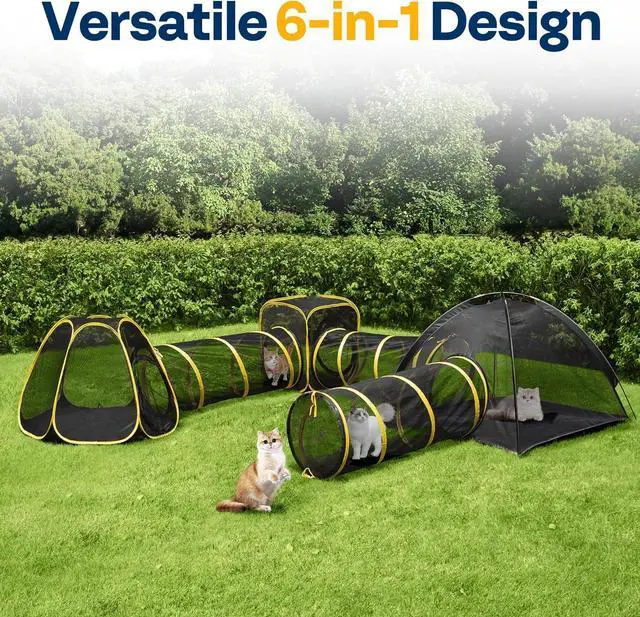 : The 6-in-1 large cat enclosure is crafted from premium, scratch-resistant materials for enduring use; The durable black mesh sides provide excellent ventilation, while the claw-resistant 210D Oxford cloth base and bright yellow edging enhance durability; 420D reinforced pole sleeves with double stitching and sturdy fiberglass poles provide strength, plus easy-access resin zippers, Its ideal for your backyard, garden, or patio, offering a secure and cozy haven for your cat