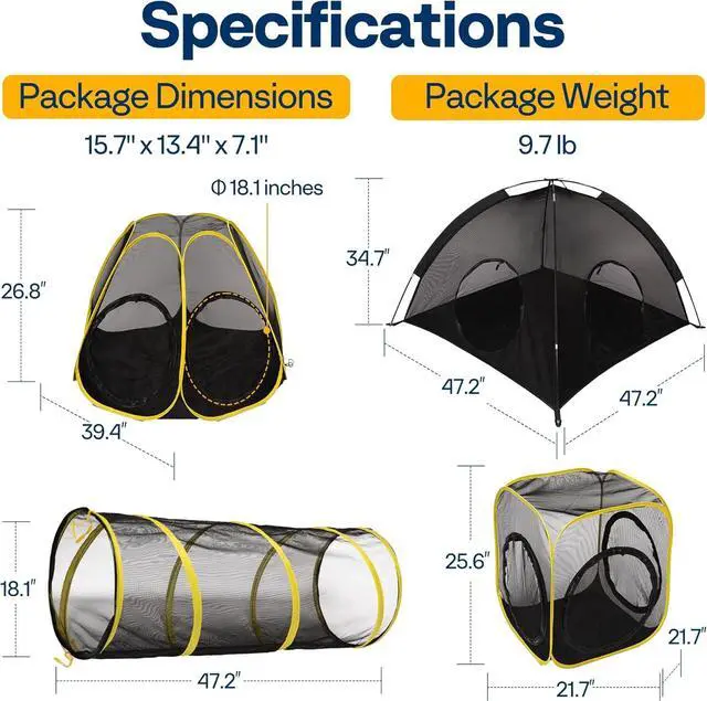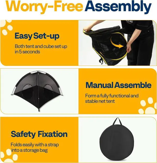 : The six-panel mesh tent and cubed playpen have a pop-up design for easy setup, with ground nails securing the bottom of each side; In contrast, the large cat tent requires manual assembly and is secured at the four corners with 14 included ground stakes; It folds easily into a storage bag with a strap, making it lightweight and portable; Whether youre heading to the park, on a trip, or just stowing it away, this enclosure makes setup and takedown a breeze