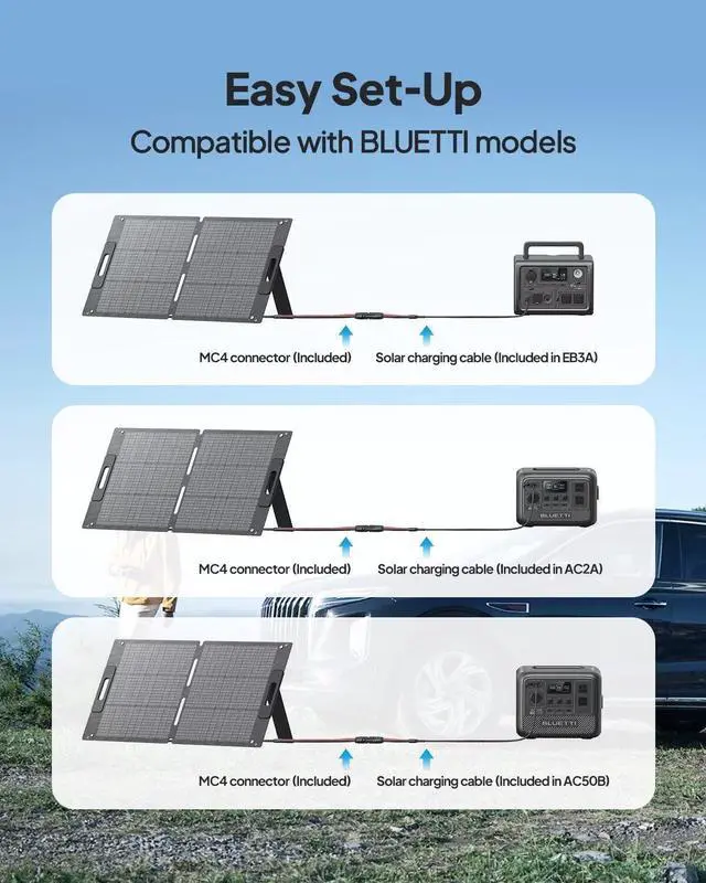 [100W Solar Panel] - BLUETTI 100W portable solar panel is compatible with solar generator like EB3A AC2A AC50B AC70 AC180 AC200L Elite 200 V2 AC300 B300K Handsfree 1 & 2 and others on the market.