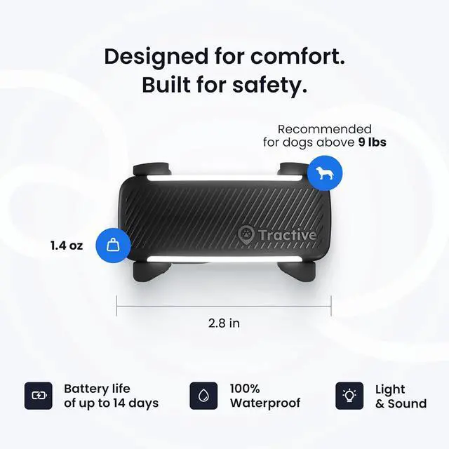 LIGHTWEIGHT & WATERPROOF: Tough yet light enough for any dog over 8 pounds. Fully waterproof, with up to 14 days battery life. Now featuring a brighter LED and louder sound for easier tracking.