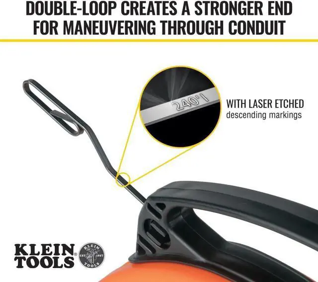 The Klein Tools' 240-Foot High Carbon Steel Fish Tape is perfect for wire runs associated with commercial, residential and voice-data-video installations. The optimized housing and handle design decreases payout effort and reduces binding. A multiple-position handle allows for a firm, steady grip as you pull or rewind the tape. The unique interior case shape combines the leverage of square cases and the comfort of round cases, which makes rewinding tape after a long run easier. The tape features laser-etched descending markings placed at every foot. These markings allow you to accurately measure the depth of conduit runs and determine the amount of tape left to pay out.